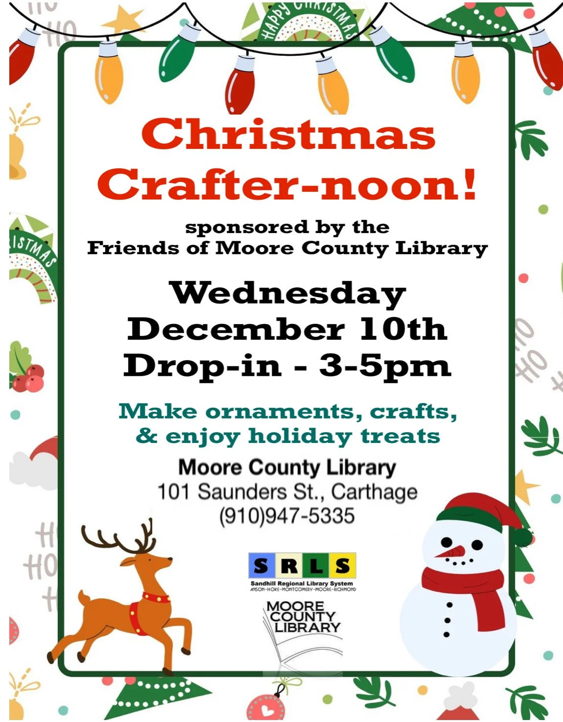 Back to All Events Christmas Crafter-noon! Wednesday, December 10, 2025 3:00 PM 5:00 PM Moore County Library 101 West Saunders Street Carthage, NC, 28327 United States (map) Google Calendar ICS Join us at Moore County Library in Carthage on Wednesday, December 10 for an afternoon of ornament making, crafts, and refreshments! All ages welcome. Drop in anytime between 3:00 and 5:00pm. Sponsored by the Friends of Moore County Library.