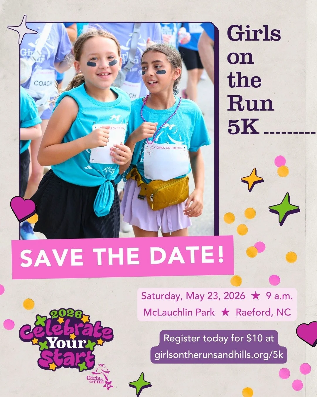 Girls on the Run Sandhills is a nonprofit that uses running to help girls in grades 3–8 build confidence, resilience, & life skills. This is our 1st year in Moore County, and we’re hosting our first-ever Girls on the Run 5K on Saturday, May 23 at McLauchlin Park in Raeford.