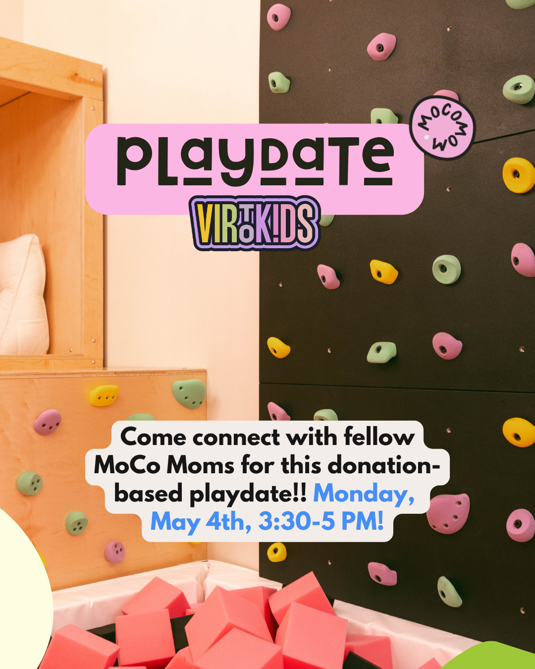 VirtoKids is shifting to a donation-based open play model, and Abbey’s saving a special slot just for us! Join us and fellow MoCo Moms on Monday, May 4th from 3:30 to 5 PM — the perfect time to beat that mid-afternoon slump after naps (before the dinner rush begins).