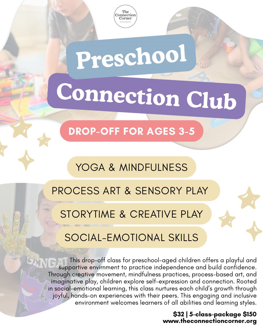 This drop-off class for preschool-aged children offers a playful and supportive envirnment to practice independence and build confidence. Through creative movement, mindfulness practices, process-based art, and imaginative play, children explore self-expression and connection. Rooted in social-emotional learning, this class nurtures each child’s growth through joyful, hands-on experiences with their peers. This engaging and inclusive environment welcomes learners of all abilities and learning styles.