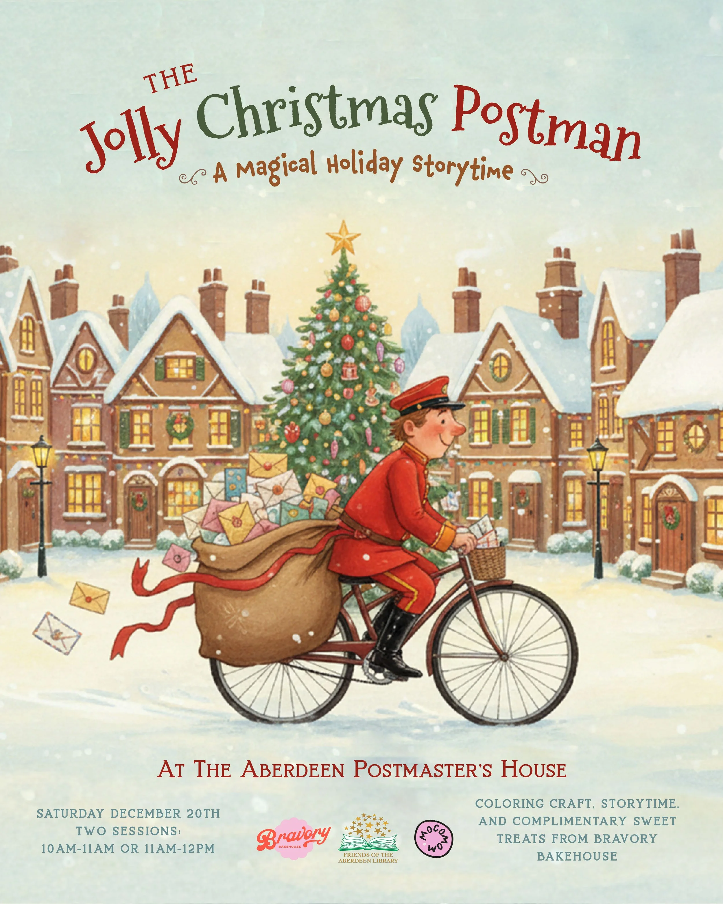 Step into the pages of The Jolly Christmas Postman for a festive holiday storytime inside one of Aberdeen’s most beloved historic homes. Families are invited to enjoy a cozy Christmas read-aloud, a hands-on coloring craft, and complimentary sweet treats from Bravory Bakehouse.