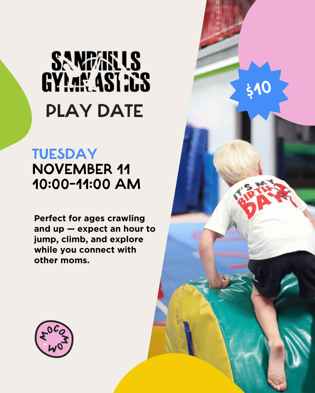 School’s out, so we’re meeting up for a fun morning at Sandhills Gymnastics— the perfect place to let your littles burn some energy while moms try to catch up alongside them. 😉
